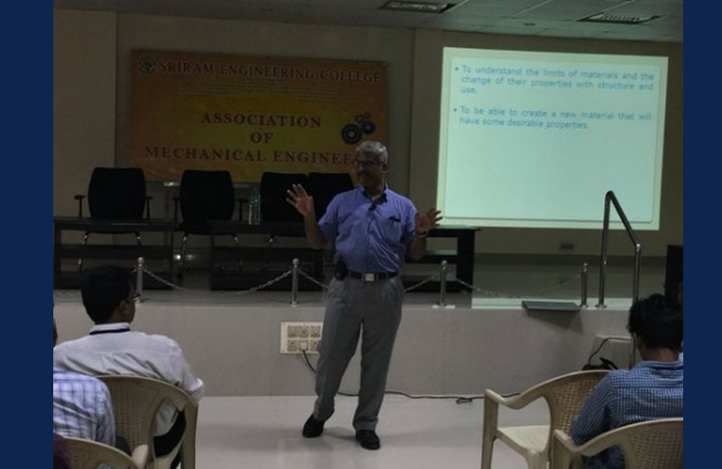 The Guest Lectures was conducted in Mechanical Engineering Department of Sriram Engineering College on 19.2.2018. The program started at 10.30 A.M with inauguration. The Resource person for the session was Dr. Mohandas, Associate Professor, Department of Mechanical Engineering, SVCE, Sriperumbadur. The topic was Advances in Materials and Metallurgy. Basics of Material science, Need for Solid solutions and Applications of Iron-Carbon Diagram were discussed. The target audience for the session was II year Mechanical Engineering students. The overall feedback of the session was very good.