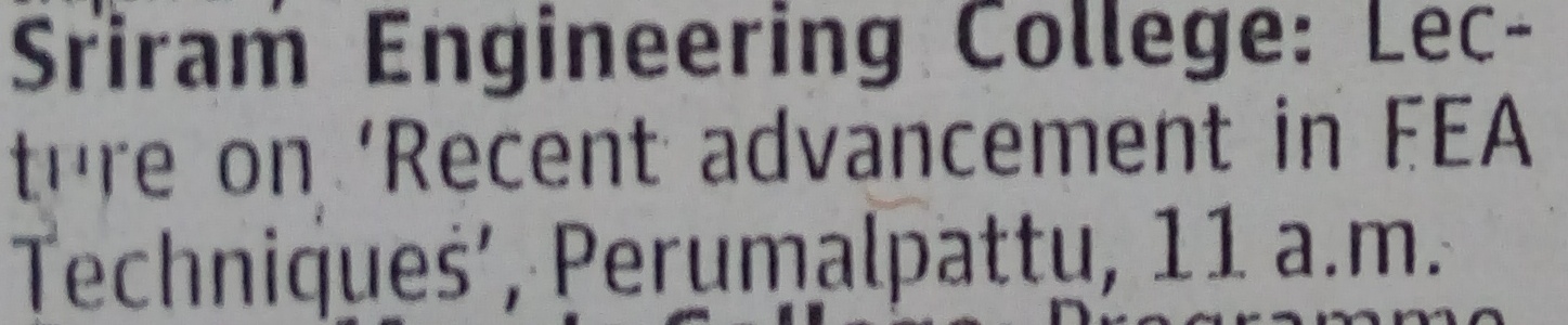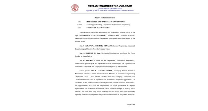| 1 | Mechanical department of Sriram Engineering college organized a guest lecture on “THE RECENT TRENDS IN METROLOGY AND MEASUREMENTS “ on 07.09.2015.Chief guest,Thiru. V. Selvarangarajan scientist G (retired) ISRO , Sriharikota ,Andrapradesh in his lecture briefed about Global Economy of 21st century companies need to be competitive Lower Production Costs ,more competitive also challenges of are happening in the field of Metrology & Measurement More Metrology on the Shop Floor , Non- Contact Metrology, Growing use of more flexible and portable devices, Software with better user interfaces. He added some of the advantages of the metrology. He concluded Modern Metrology is moving towards becoming more, Faster Smarter, Smaller, Closer and User Friendly. Dr.R.Nalini, Principal welcomed the gathering and explained the facilities available in the department. Dr.S.Ravi/ HOD/ Mechanical Engineering and Dr.P.Prabhu/ Associate Professor/ Mechanical Engineering organized the guest lecture. |