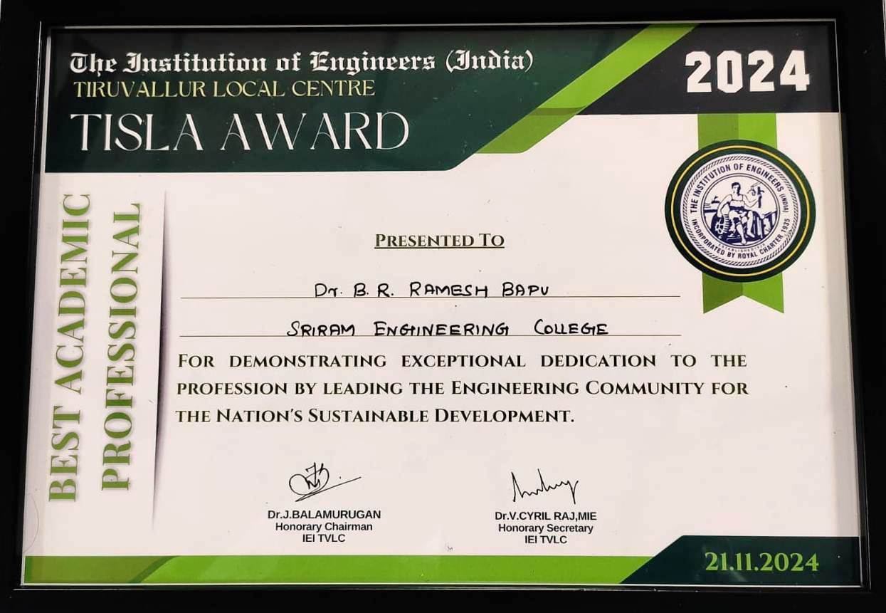 Congratulations on the recognition from the Institution of Engineers ( India). It is a proud moment for our institution to be identified for two prestigious awards ( TISLA AWARD 2024 ). The Best Green Campus Award and The Best Academic Professional Award for Principal Dr. B.R. Ramesh Bapu. The program was held at Dr. M.G.R. University, Maduravoyal, Chennai, on 21-11-2024.