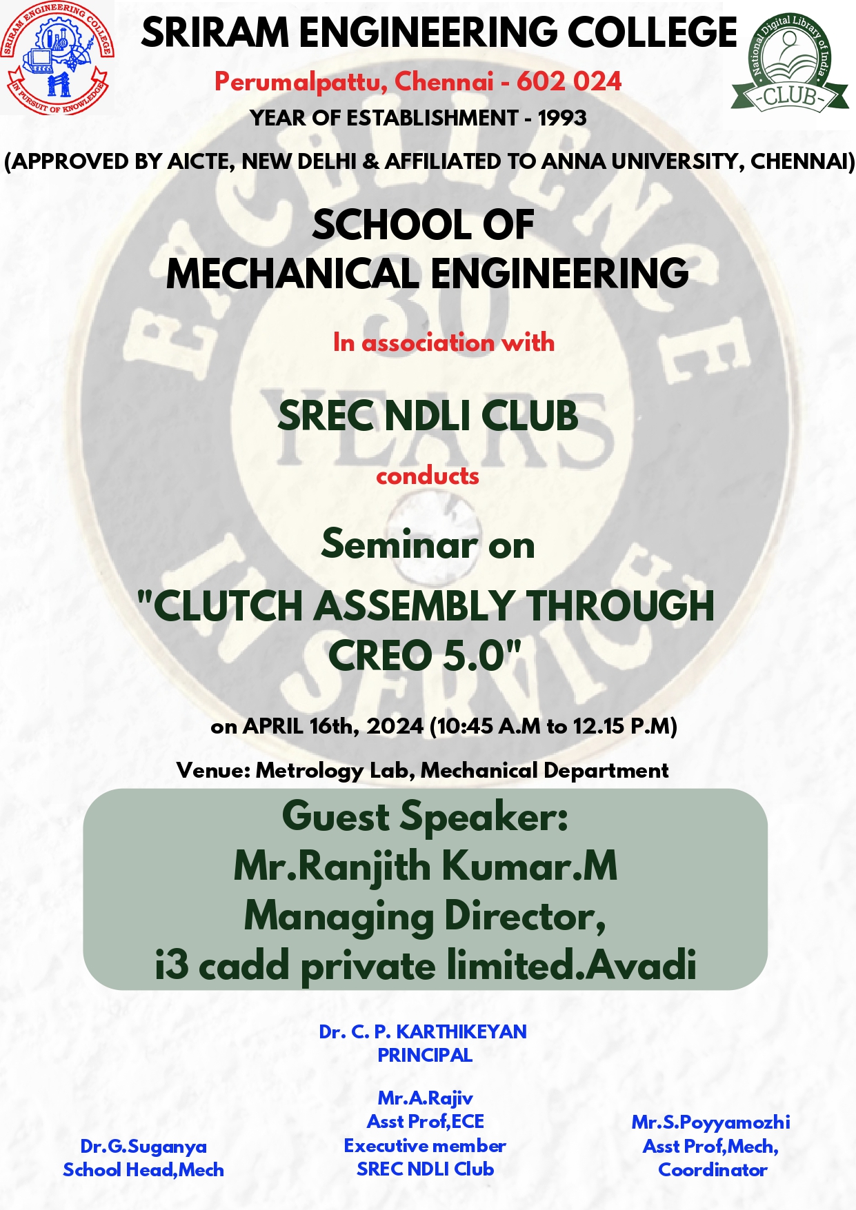 Sriram Engineering College - School of Mechanical Engineering in association with SREC NDLI CLUB Organized a seminar " CLUTCH ASSEMBLY THROUGH CREO 5.0 " Date & Time : 16th April 2024 (10:45 a.m to 12:15 p.m) Venue : Metrology Lab, Mechanical Department Guest Speaker : Mr. Ranjith Kumar. M Managing Director, i3 Cadd Private Ltd., Avadi.