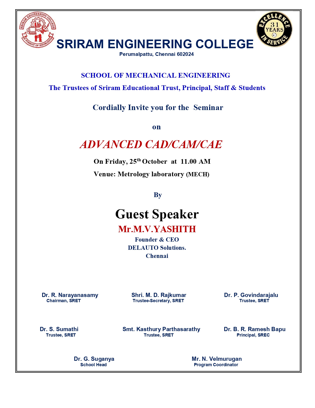 Sriram Engineering College School of Mechanical Engineering Organised a seminar on ADVANCED CAD/CAM/CAE on friday 25-10-2024 at 11.00 a.m in Metrology lab. Guest speaker : Mr. M.V.Yashith Founder & CEO DELAUTO Solutions, Chennai