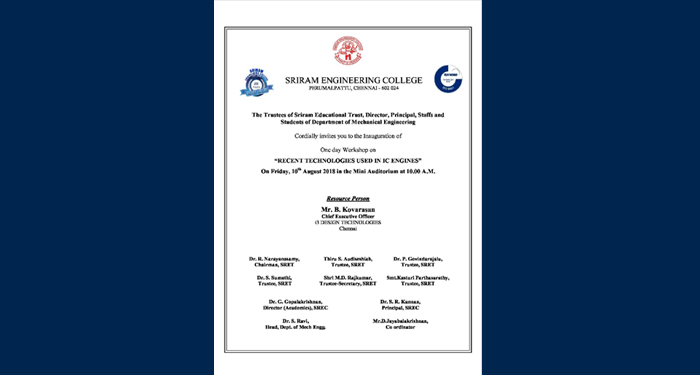 The National level one day Seminar on Recent Trends in Industrial Design Softwrare was conducted in Mechanical Engineering Department of Sriram Engineering College on 14.03.2018. Dr.S.Ravi. Professor and Head, welcomed the gathering and also explained the importance of Design softwares in industry. The Resource person for the session was Mr.MithunLal H, Application Engineer, Institute of Industrial Design and Chennai. The topic covered during seminar sessions are 3D Printing, Reverse Engineering and Sketching etc. The audience for the session was II and III year of Mechanical and Automobile Engineering students. Finally Vote of thanks was given by the Event Coordinator Mr.D.Jayabalakrishnan, Assistant Professor/Mechanical