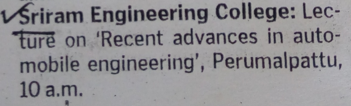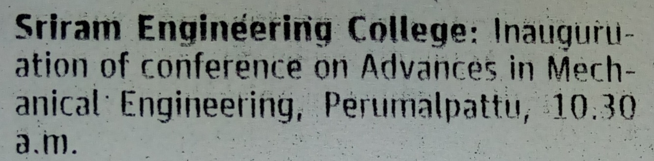 | 1 | Mechanical department of Sriram Engineering college organized a guest lecture on “THE RECENT TRENDS IN METROLOGY AND MEASUREMENTS “ on 07.09.2015.Chief guest,Thiru. V. Selvarangarajan scientist G (retired) ISRO , Sriharikota ,Andrapradesh in his lecture briefed about Global Economy of 21st century companies need to be competitive Lower Production Costs ,more competitive also challenges of are happening in the field of Metrology & Measurement More Metrology on the Shop Floor , Non- Contact Metrology, Growing use of more flexible and portable devices, Software with better user interfaces. He added some of the advantages of the metrology. He concluded Modern Metrology is moving towards becoming more, Faster Smarter, Smaller, Closer and User Friendly. Dr.R.Nalini, Principal welcomed the gathering and explained the facilities available in the department. Dr.S.Ravi/ HOD/ Mechanical Engineering and Dr.P.Prabhu/ Associate Professor/ Mechanical Engineering organized the guest lecture. |