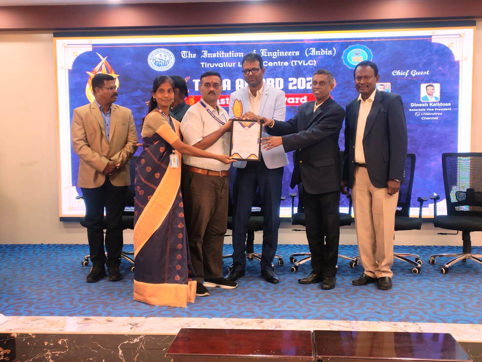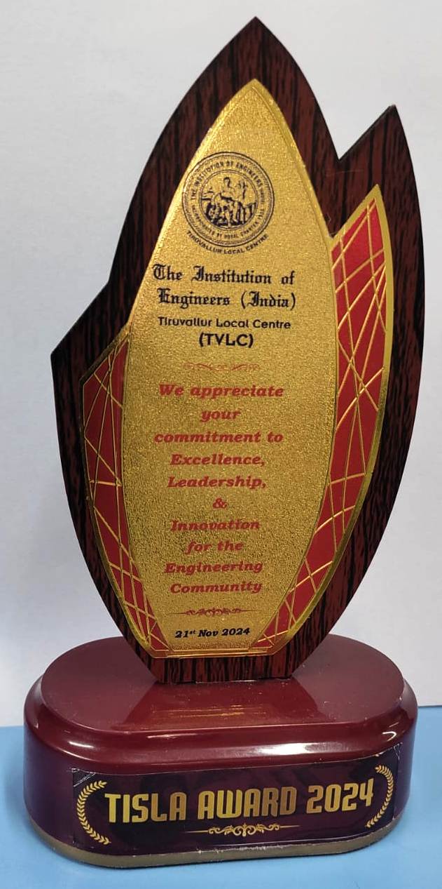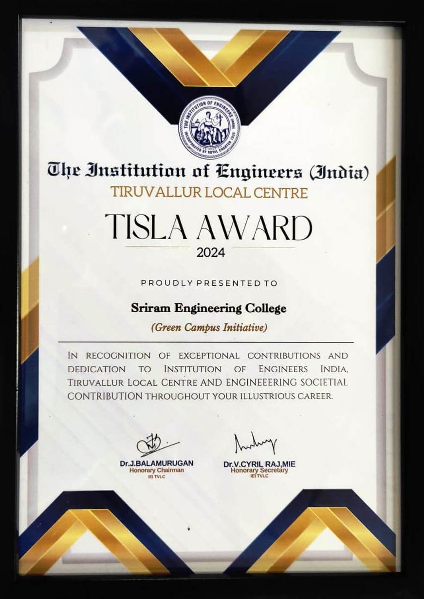 Congratulations on the recognition from the Institution of Engineers ( India). It is a proud moment for our institution to be identified for two prestigious awards ( TISLA AWARD 2024 ). The Best Green Campus Award and The Best Academic Professional Award for Principal Dr. B.R. Ramesh Bapu. The program was held at Dr. M.G.R. University, Maduravoyal, Chennai, on 21-11-2024.