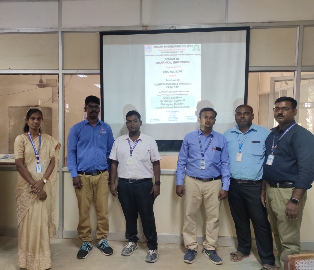Sriram Engineering College - School of Mechanical Engineering in association with SREC NDLI CLUB Organized a seminar " CLUTCH ASSEMBLY THROUGH CREO 5.0 " Date & Time : 16th April 2024 (10:45 a.m to 12:15 p.m) Venue : Metrology Lab, Mechanical Department Guest Speaker : Mr. Ranjith Kumar. M Managing Director, i3 Cadd Private Ltd., Avadi.